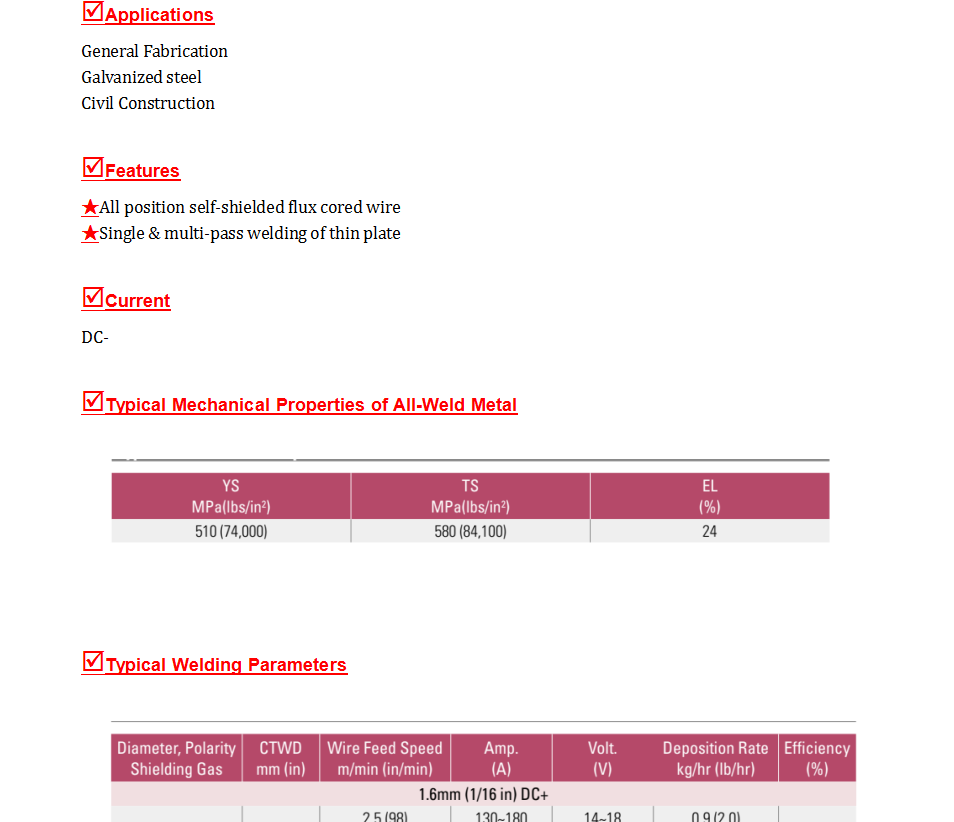 A Titania type CO2 gas-shielded flux -cored welding wire. It has high welding efficiency.
